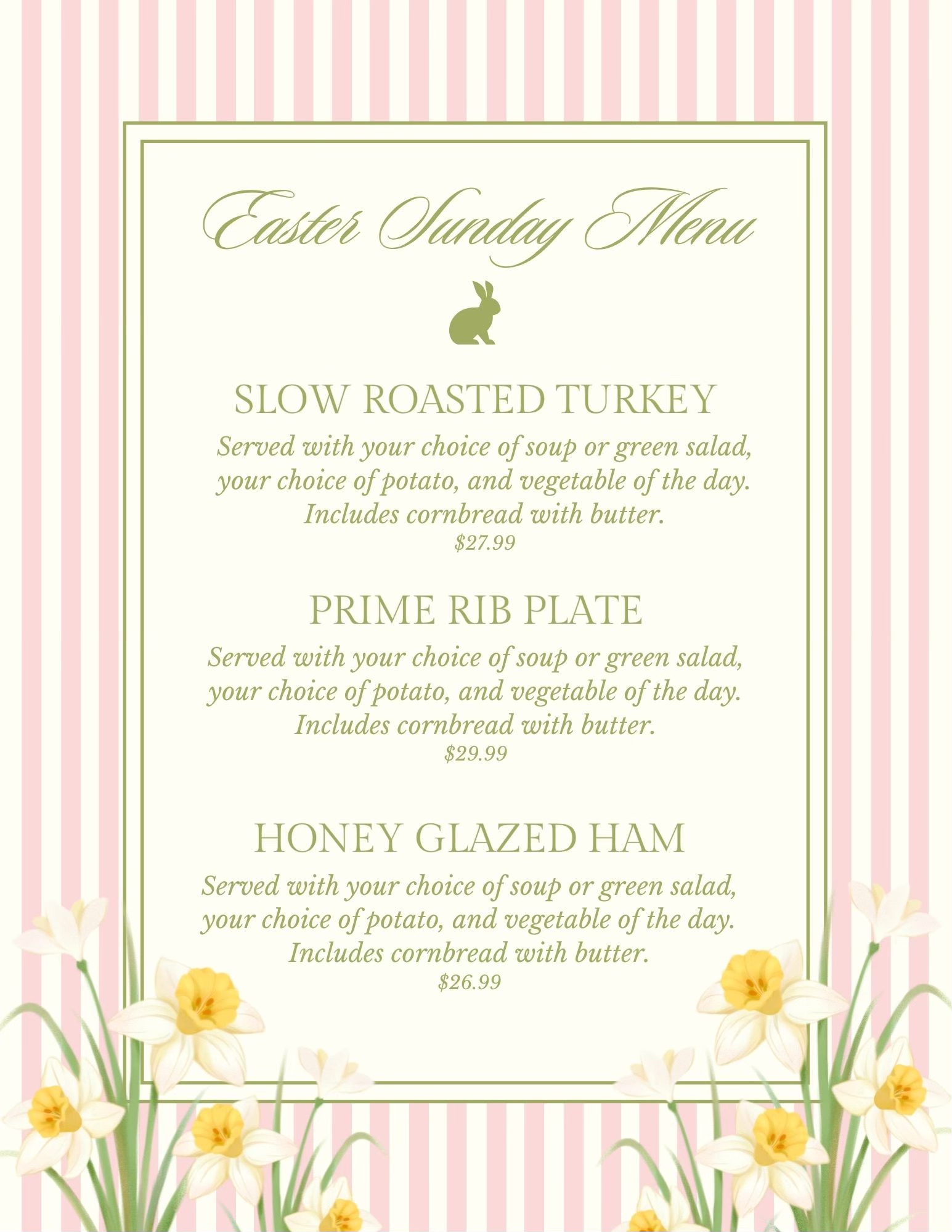 Served with soup or salad, choice of potato, vegetable & cornbread with butter.